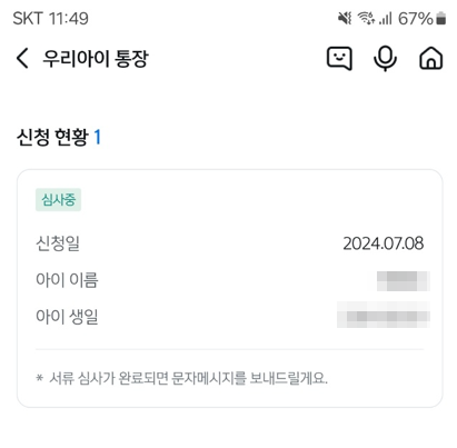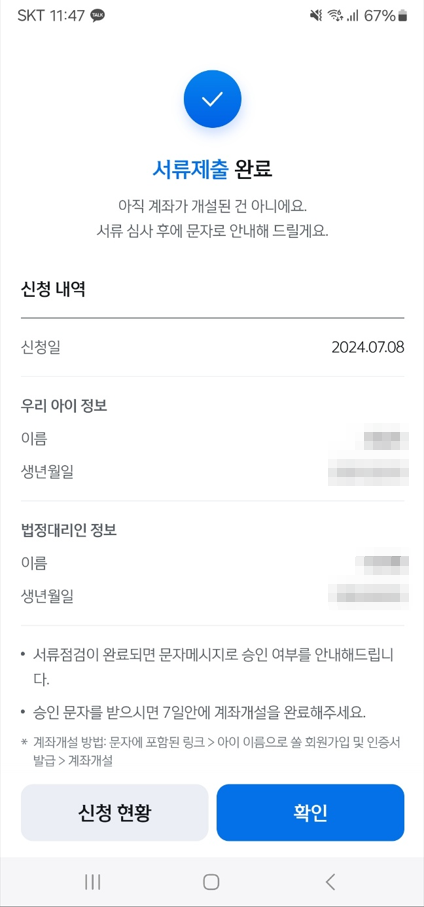 30초 정도 기다렸더니 서류제출이 완료되었다는 문구를 확인할 수 있었습니다. 계좌가 개설된 건 아니고 서류 심사 후에 문자로 안내를 해주면 추가로 진행하면 되는데, 신청 현황도 바로 확인이 가능합니다.