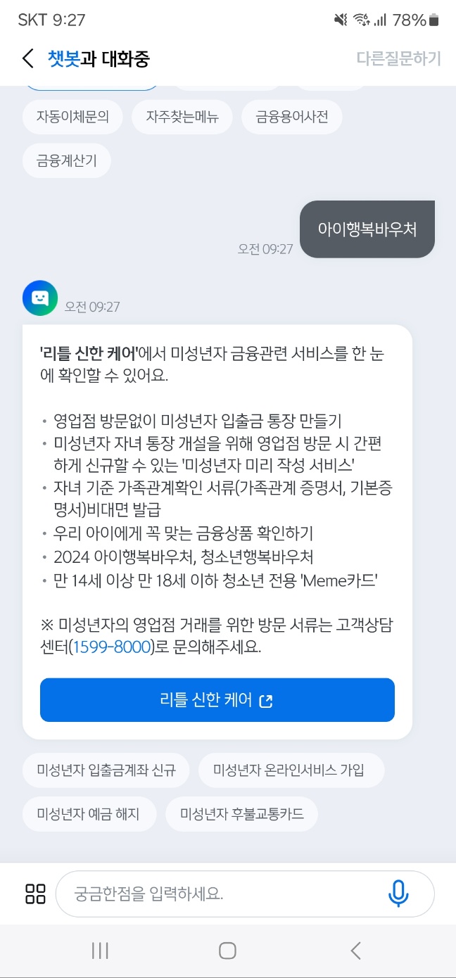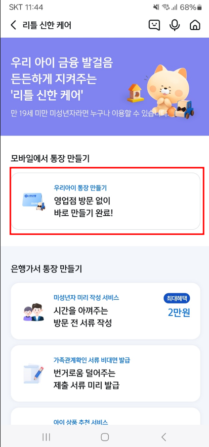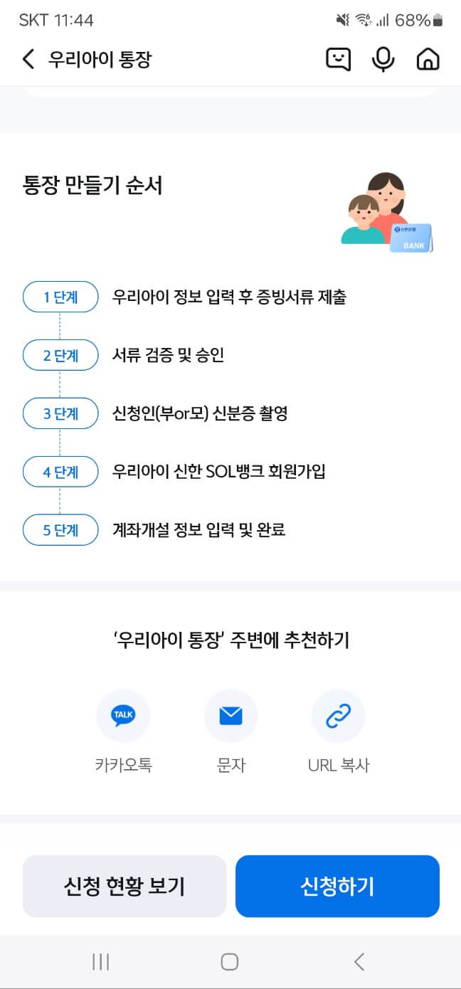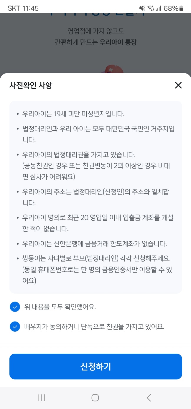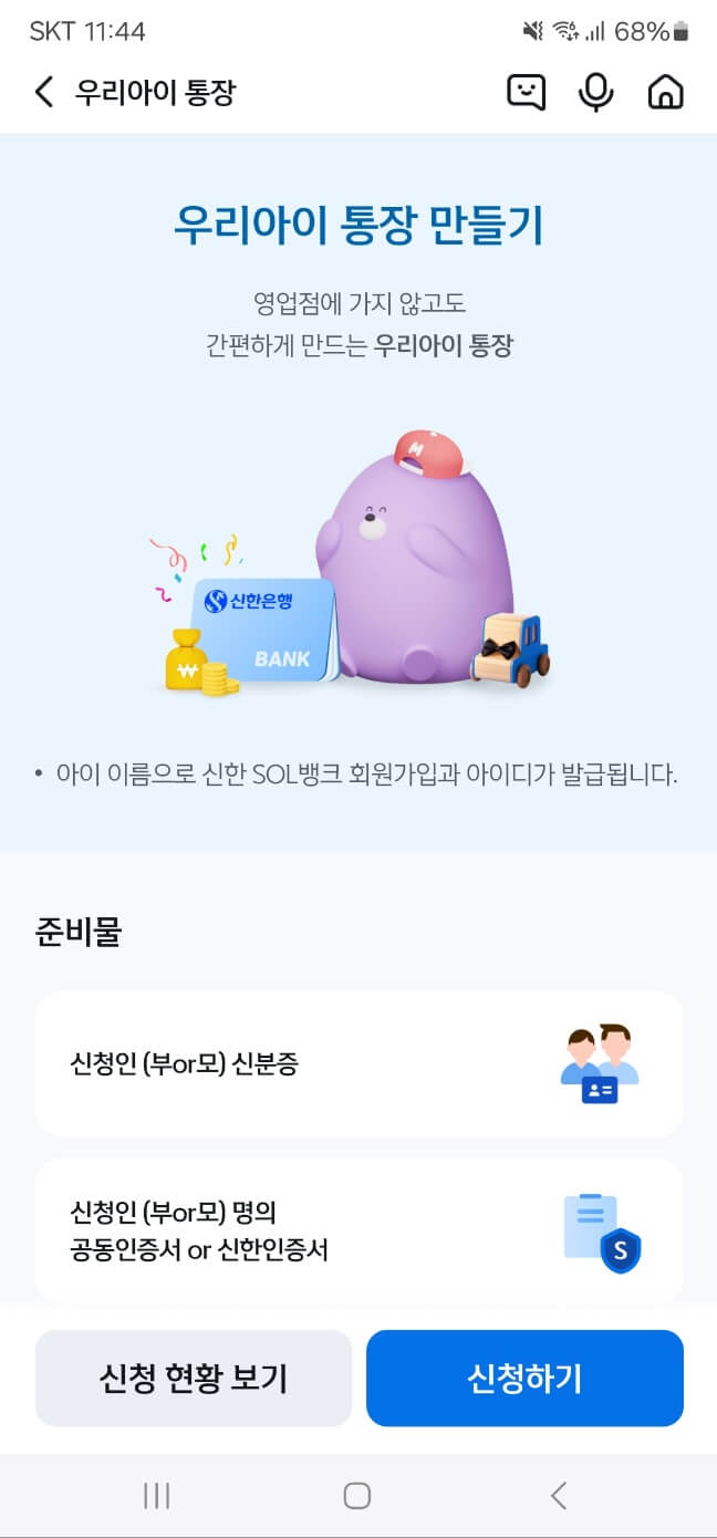 며칠 전에 아이 통장을 개설하기 위해 신한은행에 방문하기 전에 미성년자 미리 작성 서비스를 집에서 제출하고 갔더니 통장 만드는 시간이 많이 단축되었습니다. 아이 통장을 만드는 데는 일