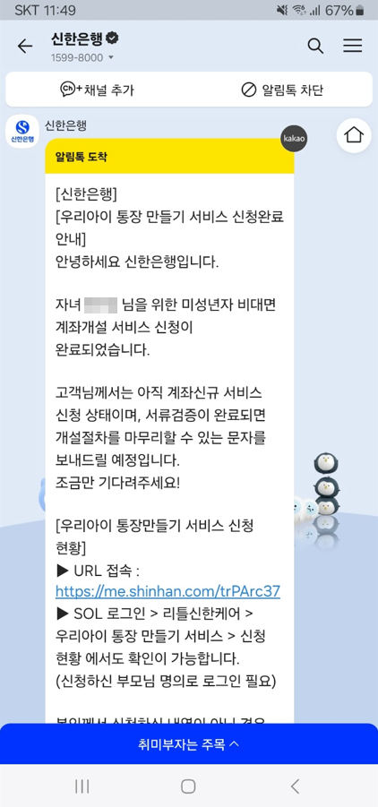 은행에서 확인 후 문자를 주는데, 친절하게 카톡으로도 다시 한번 안내를 해주기 때문에 현황을 놓칠 염려는 없습니다.