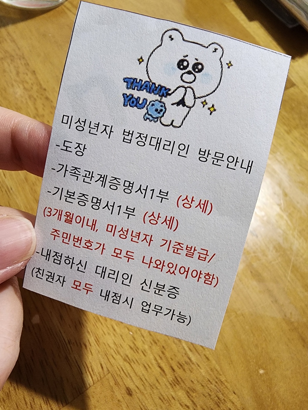 이때, 가족관계증명서와 기본증명서는 3개월 이내 발급된 것이어야 하며, 방문하는 대리인 기준이 아닌 통장 개설을 하는 아이의 기준으로 발급해야 합니다.