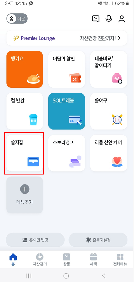로그인 후 메인 화면에서 조금만 내려서 '쏠지갑'으로 들어갑니다.