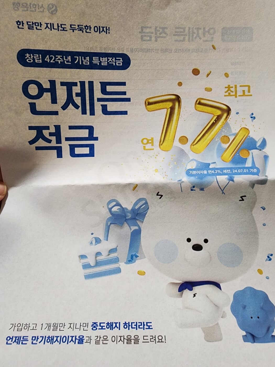 원래는 입출금 계좌와 함께 청약통장 두 개를 만들러 갔는데 마침 신한은행에서 7.7%의 높은 이율인 언제든 적금이 있다고 하여 함께 만들고 왔습니다.