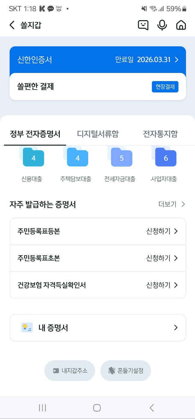 쏠지갑에 들어가면 정부 전자증명서가 보이고 제일 하단에 내 증명서를 들어가면 발급받은 증명서들이 보입니다.