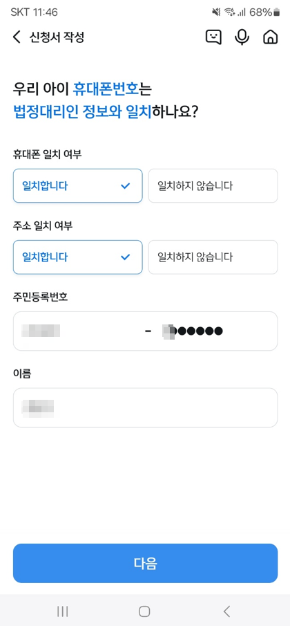그다음 아이의 이름을 적고 부모와 주소 및 연락처 일치 사항을 확인합니다.