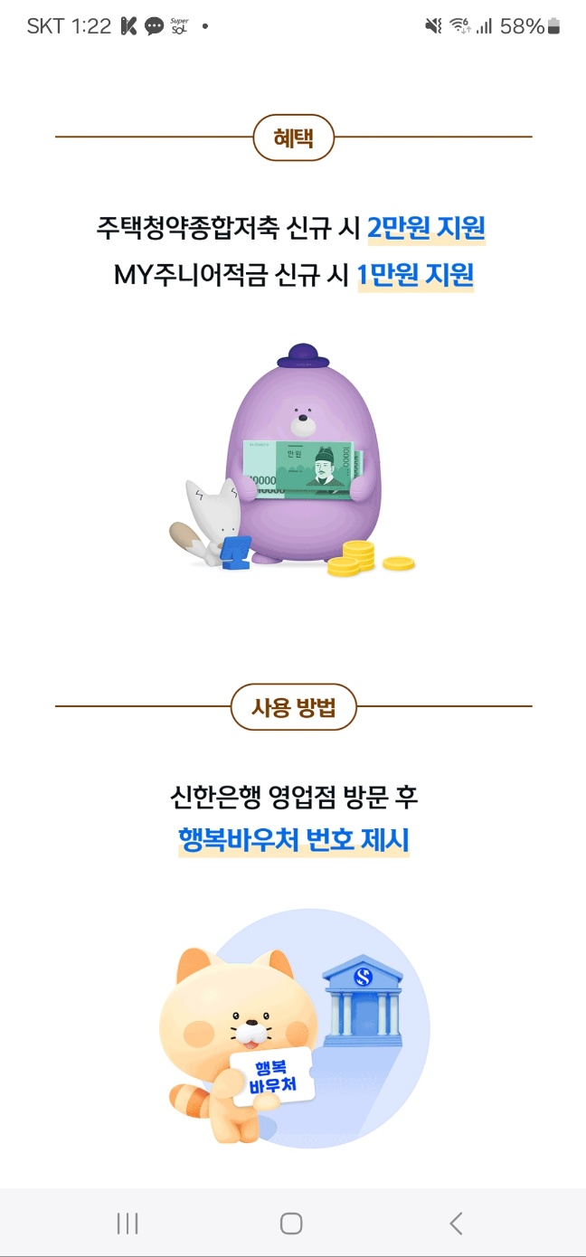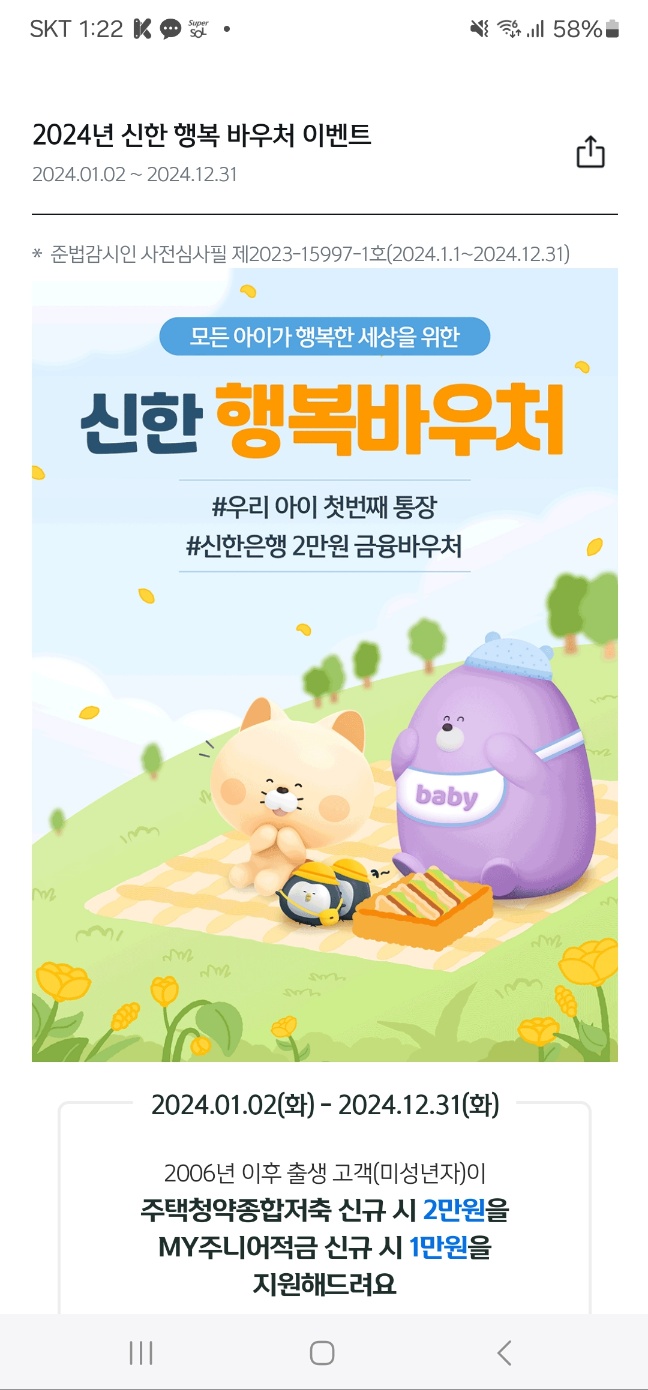 신한은행에서는 사전에 아이 행복바우처를 신청하면 청약 진행 시 2만 원 바우처를 제공하고 있습니다.