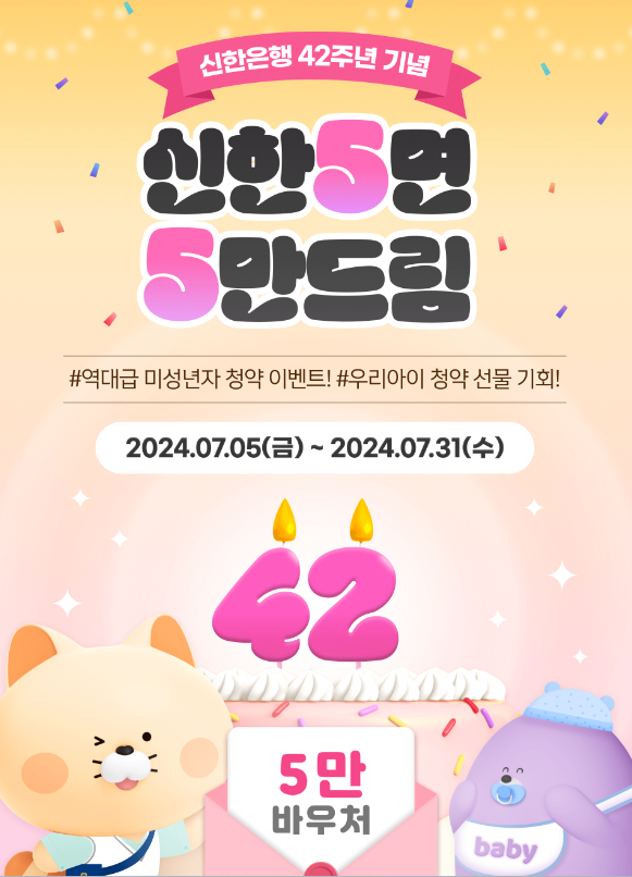 원래는 청약 2만 원 or 적금 1만 원의 바우처 혜택이지만 2024년 7월 5일부터 20 만좌 한정으로 5만 원 바우처 혜택을 주는 이벤트가 시작되었습니다.