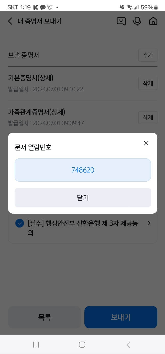 은행에 제출하고 싶은 서류를 선택한 뒤 신한은행으로 고정되어 있는 제출처를 눌러서 동의 후 보내면 문서 열람번호와 함께 전송이 완료되고 은행에서 따로 실물 서류 없이도 열람이 가능하게 됩니다.