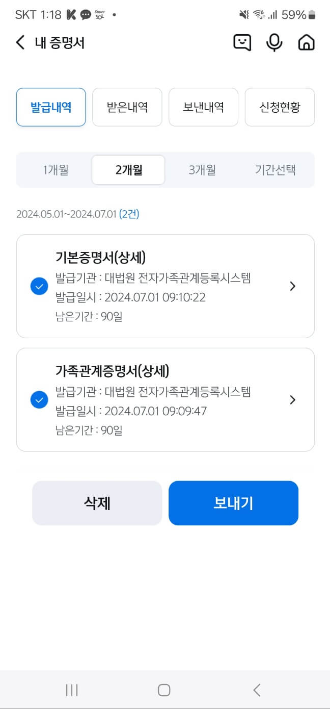 신청서를 다 작성하면 가족 관계 증명서와 기본증명서를 조회하는 문구가 나옵니다. 혹시나 조회가 되지 않는다면 전자문서지갑으로 서류를 먼저 제출해 주세요.