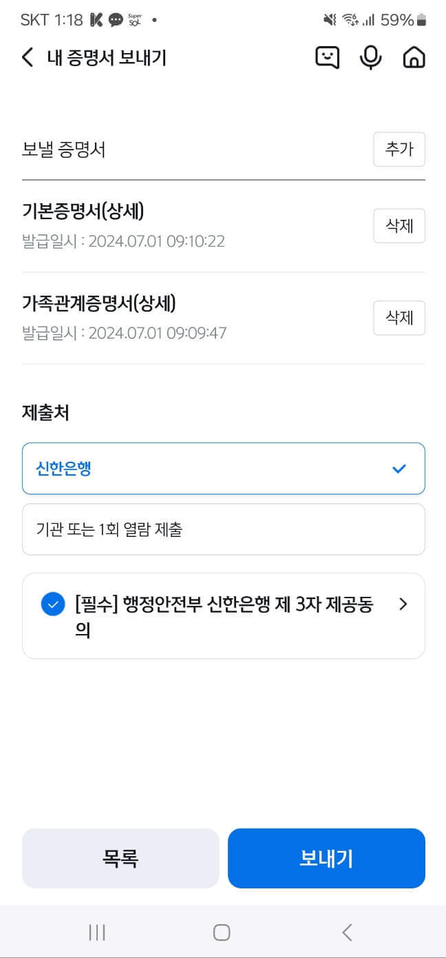 전자문서지갑에 가족관계증명서와 기본증명서를 다운받았다면 이제 신한은행 SOL 뱅크 어플에서 은행으로 두 개의 증명서를 보내주면 됩니다.