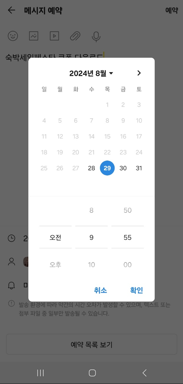 보내고 싶은 메시지를 입력 한 뒤 시간 설정까지 마친 뒤 예약을 누르면 메시지 예약이 완료됩니다.