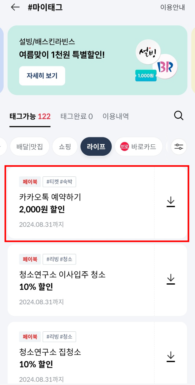 할인 기간이 8월 1일부터 9월 30일까지로 되어있지만, 마이태그에서 카카오톡 예약하기는 8월 31일까지 쿠폰을 다운로드할 수 있다고 되어있습니다.